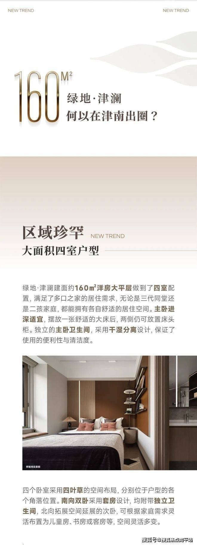 绿地·津澜建面约160m洋房大平层为四房两厅三卫设计,重视每位家庭成员的居住体验,四大卧室各安一隅,以「四叶草布局」让彼此拥有独立空间。