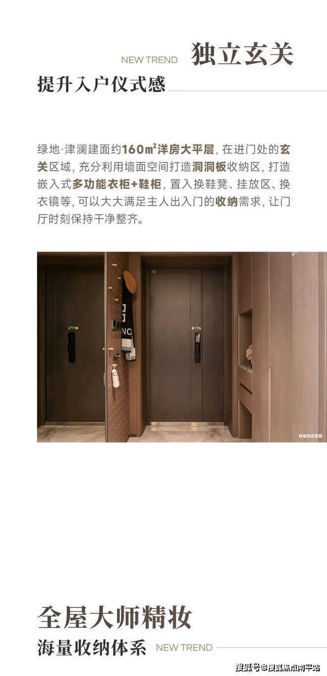 基于对改善客群日常生活习性的洞察和高阶生活方式的悄然引导,绿地·津澜建面约160m'洋房大平层,采用高配置大师精妆体系,内置海量收纳系统涵盖玄关、客厅、餐厅、卧室、卫生间五大收纳系统让每一次安放都随心所欲。