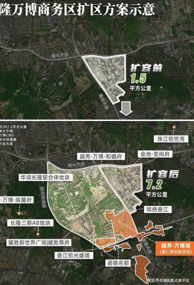 万博官宣扩容,占地面积由1.5平方公里延展至7.2平方公里,覆盖长隆、里仁洞片区,规模甚至超越6万平方公里的珠江新城,剑指世界级地标商圈。