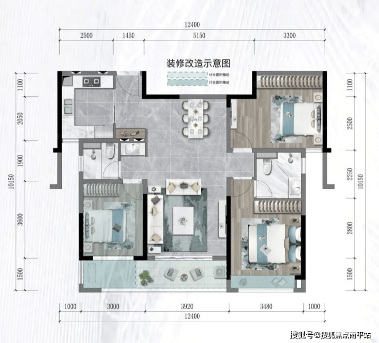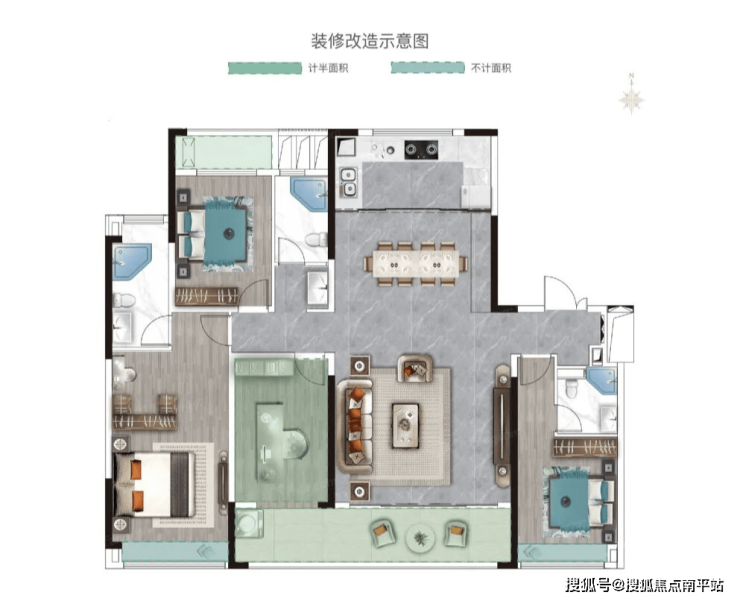 115平:这是前些年典型的鼻子户型,南北不通透,北侧厨房和次卧采光不佳,中央客厅与两侧的房间区隔不明显,居住体验欠佳。