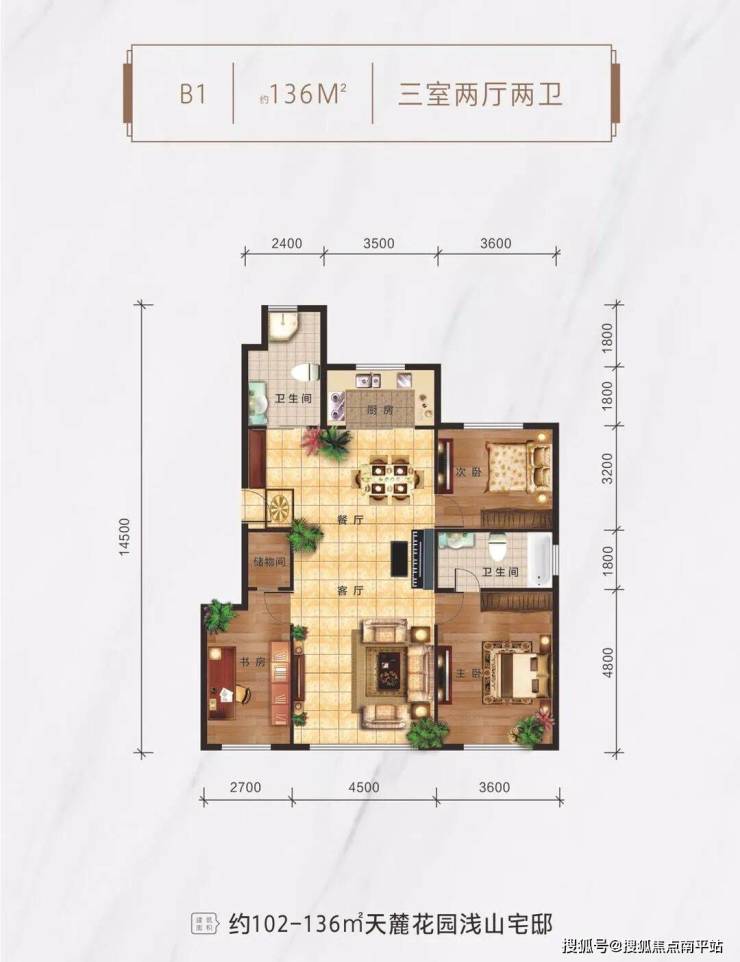 户型建面:102m²、115m²、136m²