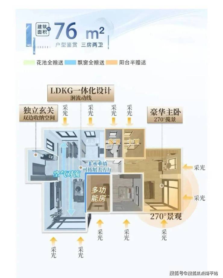 2. 采光优化:“S型”楼栋布局确保每户南向,76㎡户型客厅面宽达3.6米