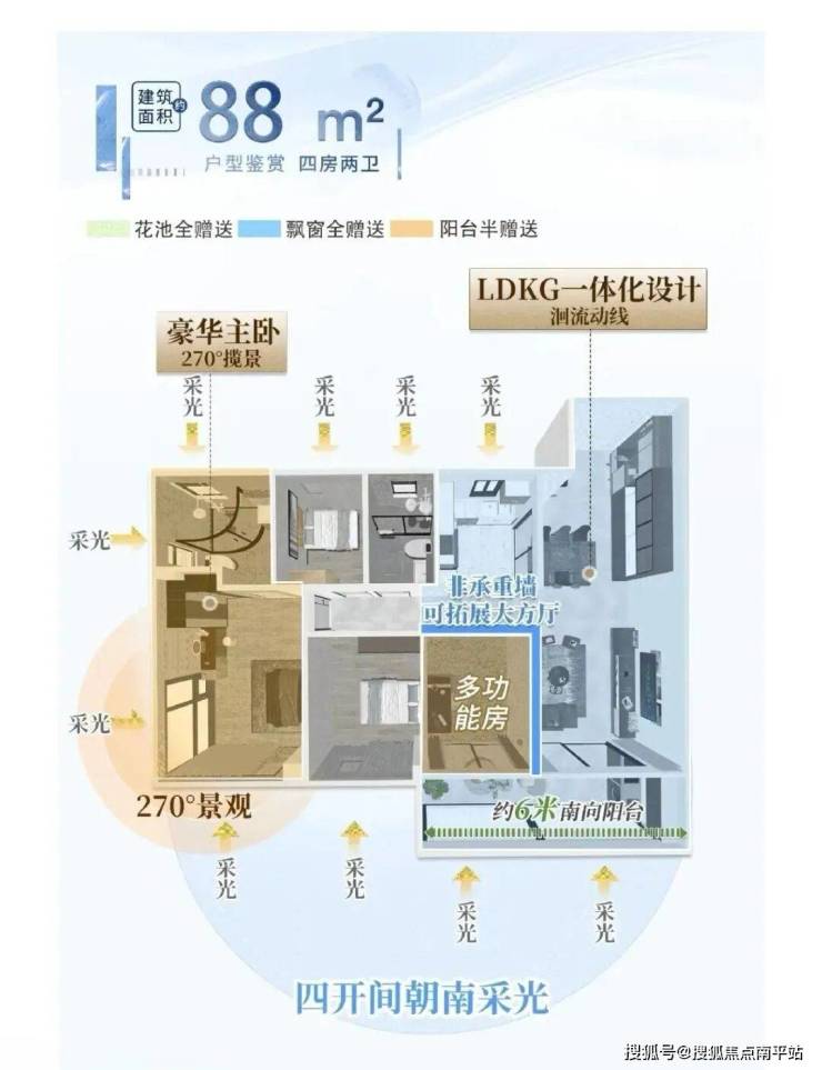 88平四房,不仅做到四房,还实现了四空间两卫双开配景观阳台。• 同等面积多一房,叫板周边一众新盘
