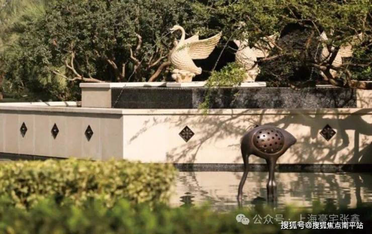 主道两边是加那利海藻配合叠水,每一株加那利海藻的大小胸径基本一致;水景中站立着砂岩天鹅,优雅、高贵。