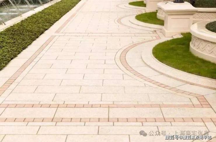 景观部分石材采用保加利亚沉香米黄,花坛云石铺设,手工雕刻花纹,地面石材铺装。