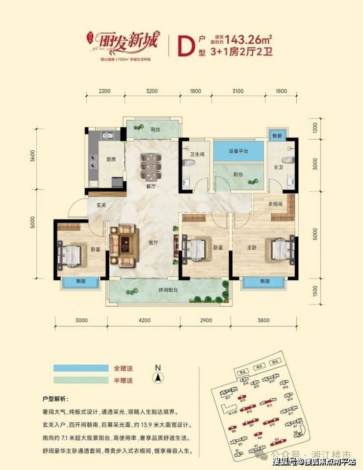 - 得房率高达93%:106㎡做3+1房,125㎡南北三阳台,143㎡纯板式四房,赠送面积全计入公摊,相当于花100㎡的钱买120㎡的使用空间;
