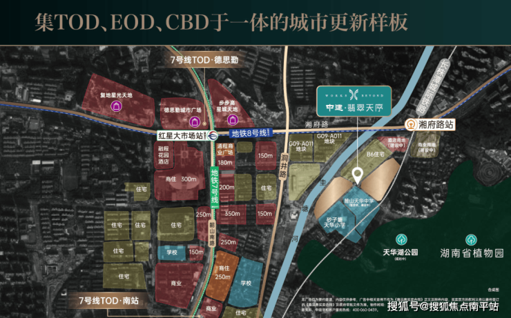 难得的是,这个地块恰好站在长沙河东两条重要中轴线的交点上:一条是商业中轴线,从五一广场到东塘、雨花亭,再到红星商圈;另一条是景观中轴线,28 公里圭塘河流域, 唯有此处与天际岭省植物园相逢。