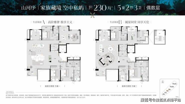 在户型设计上,山河序也将稀缺性做到了极致。整个组团仅规划 384 户, 主力户型为 185㎡与 230㎡,总价门槛超 300 万。