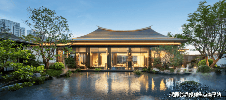 大门主入口引入“把酒店搬回家”的产品理念和“回家即度假”的生活理念,打造奢华酒店式归家大门。屋顶高约9.7米,整体挑檐向两侧延伸,长约49米,庑殿金顶的屋顶形态,以现代化的设计手法融入传统屋顶形式,结合鲁班锁倒影装置传达山水倒影的意境生活。