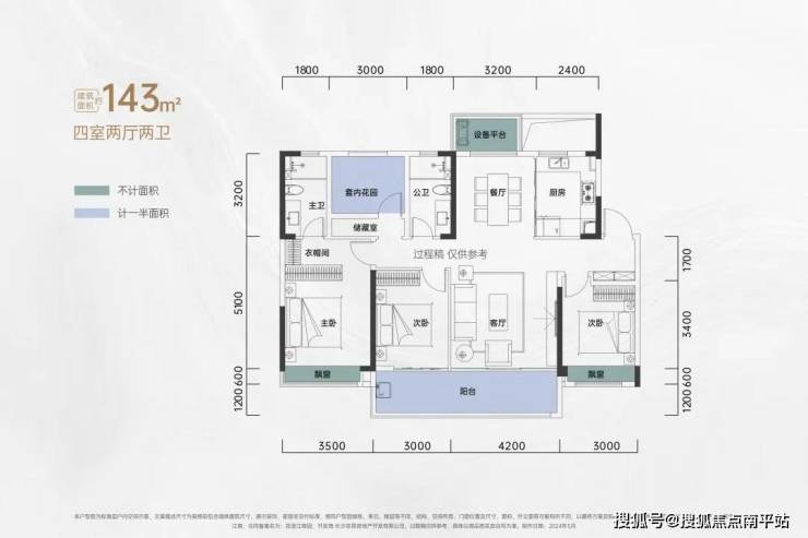约143㎡产品全部为边套户型, 4房2厅2卫设计。