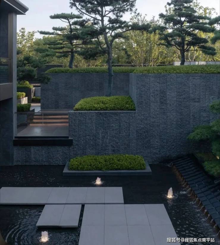 中庭局部下沉 0.8米打造下沉式花园,下层庭院辅以坡屋顶、青松、汀步等景观,营造富有东方美学的园林意境。