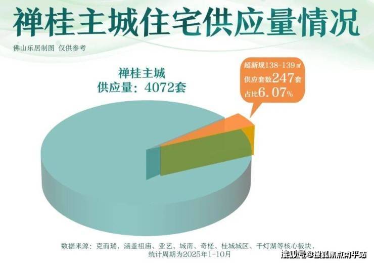 克而瑞数据显示,截至10月底,禅桂主城区建面约138-139㎡的超新规房源, 仅约247套,占总供应 仅约6%。(注:仅统计已取证房源)