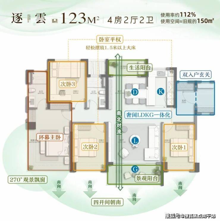 第三,它的 使用率高达112%,实际使用尺度媲美 150㎡旧规户型,南北双阳台+四房布局+最小卧室超11㎡,空间尺度非常让人心动!