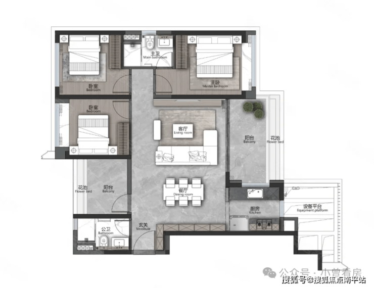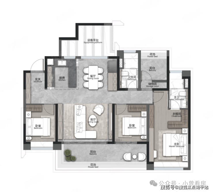目前在售的户型覆盖刚需到改善需求,得房率超过 100%,每户还配备 5-8㎡的设备平台,相当于额外多出一间房。