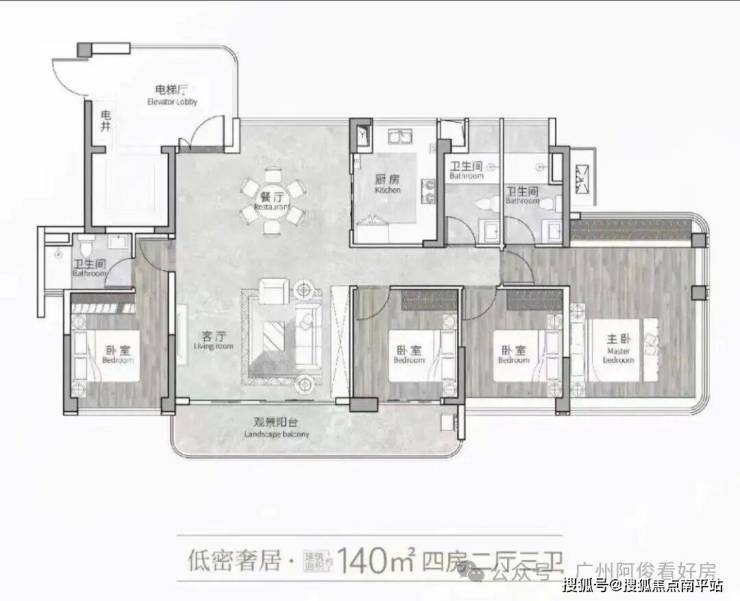 138㎡四房三卫:五开间朝南+8.3米景观阳台+双主套+110%超高使用率(新规阳台/飘窗面积优化)。