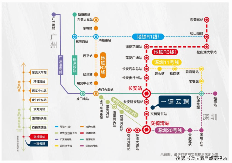 占位大湾区交通核芯枢纽之上,双TOD加持,畅享粤港澳1h黄金生活圈。约1km即到R3线长安建安路站(规划中),约2.8km即到R2线交椅湾站(建设中),约2km直达穗深城轨长安站,3站长安中心区,6站松山湖,一站前海一轨东莞CBD,约1小时覆盖广深机场、香港机场、港澳码头,擎领湾区未来生活。
