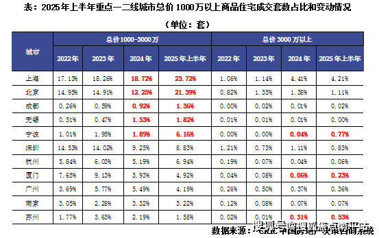 帝景苑、天樾云颂一二期、宸启瑞湖一二期、保利安控新天悦、五缘湾TOD轨道地块、恒禾七尚、银聚祥邸、万科湖心岛、新景七星公馆、新景禾祥高峰会.2025年上半年重点一二线城市千万豪宅成交占比持增。分总价段来看,重点城市诸如上海、北京、成都、无锡、宁波等2025年上半年总价1000-3000万豪宅成交占比较2024年增幅较为显著;宁波实现跳增,由2024年1.89%增至6.16%。