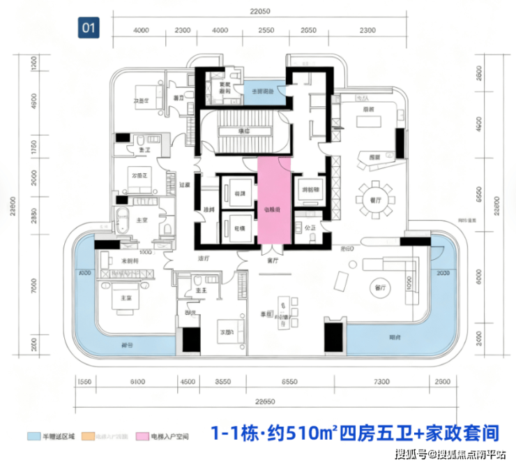 1A栋(1栋一单元)-43层 : 3梯1户 ,约 510㎡ ,一层一户,私密性极致,为项目旗舰户型。