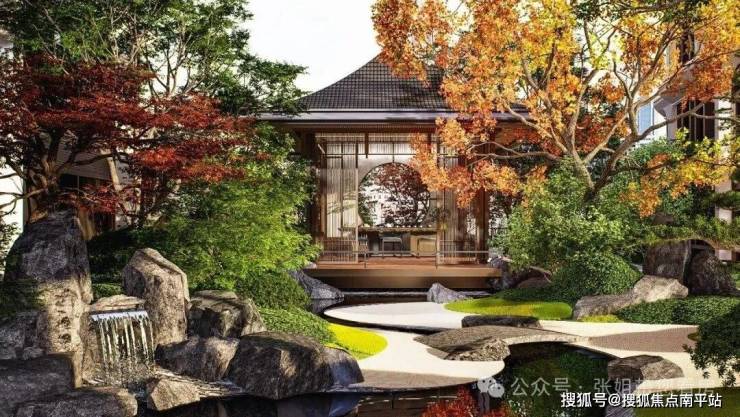 轴线空间搭配观景亭、枯山水、假山叠瀑,置身其中,仿佛漫步于私家公园。