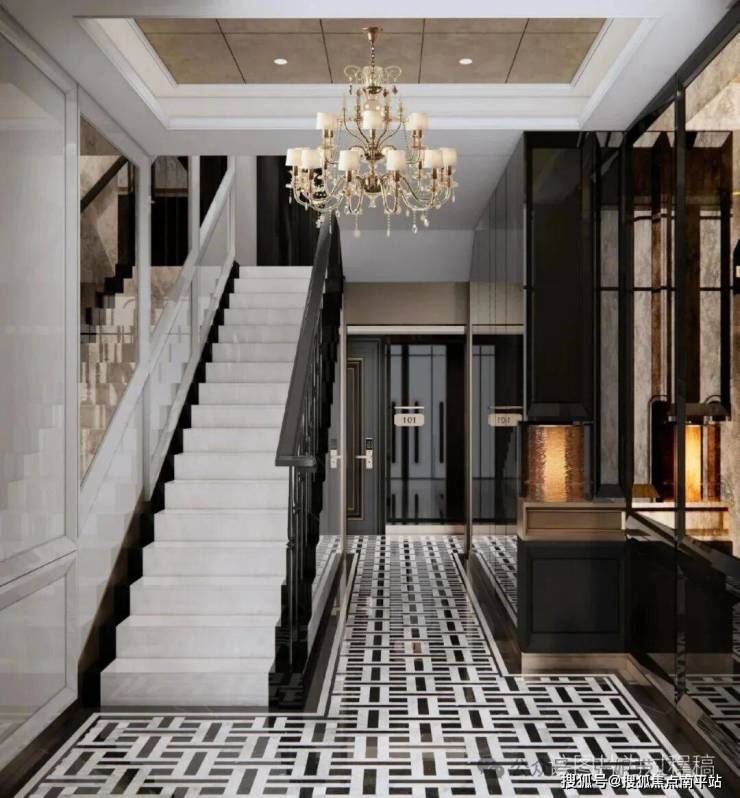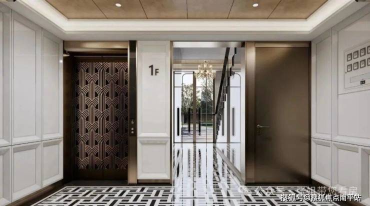 首层公区电梯厅,则采用了石材地面拼花、古铜色金属门套、蚀刻纹样、丝绒漆等,让归家成为一种视觉享受。