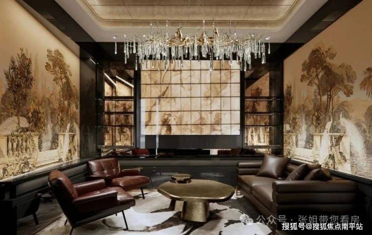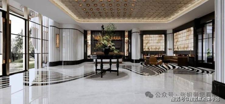 首层公区大堂搭配丝绒漆、古铜金属、深色岩板、锈镜、浅色石材、深色石材、金属踢脚等,保持风格高度统一。