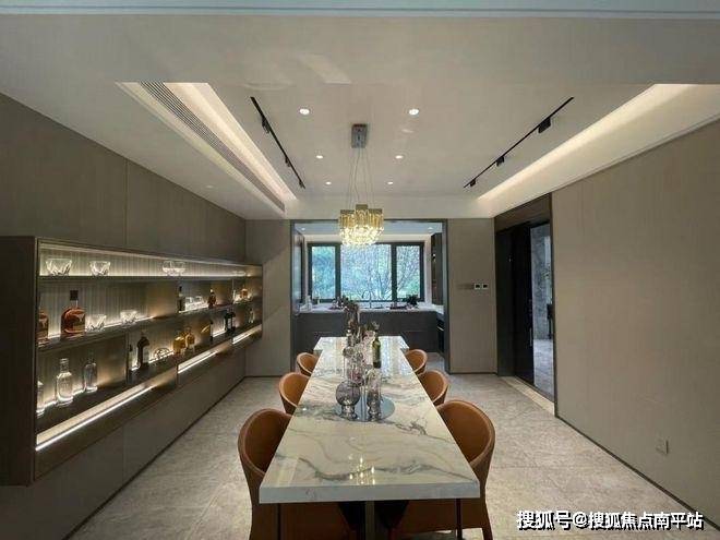 同时因为开间、进深充足,餐厨区域装修自由度较大,样板间内放置一张六人餐桌,但两边的过道依然宽敞。餐厅墙体的长度也呈现宽厅的配置,可做功能划分、收纳柜等设计。