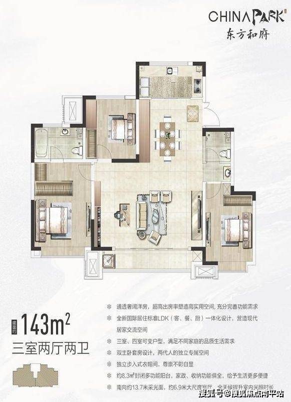 143平米的户型设置上将客厅、餐厅、厨房设置在一条动线上,客餐厨LDK一体化,方便家人交流。