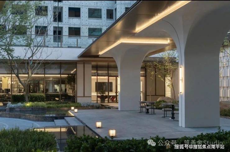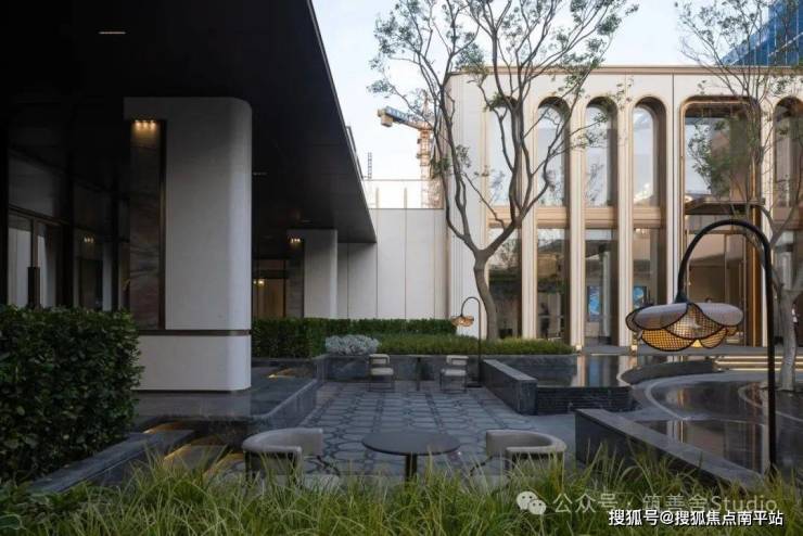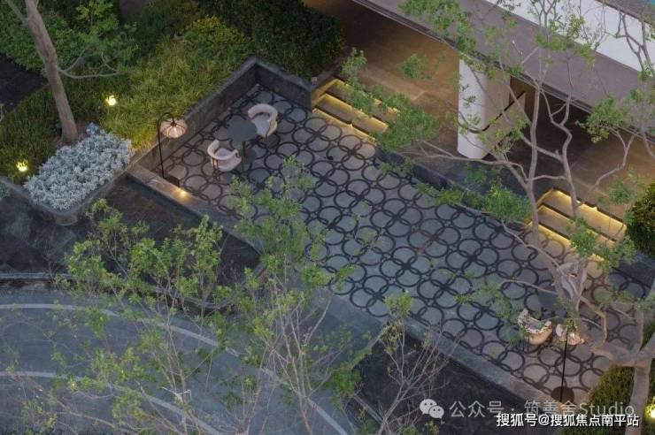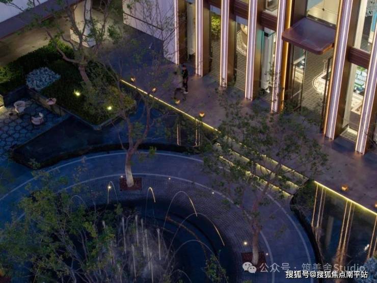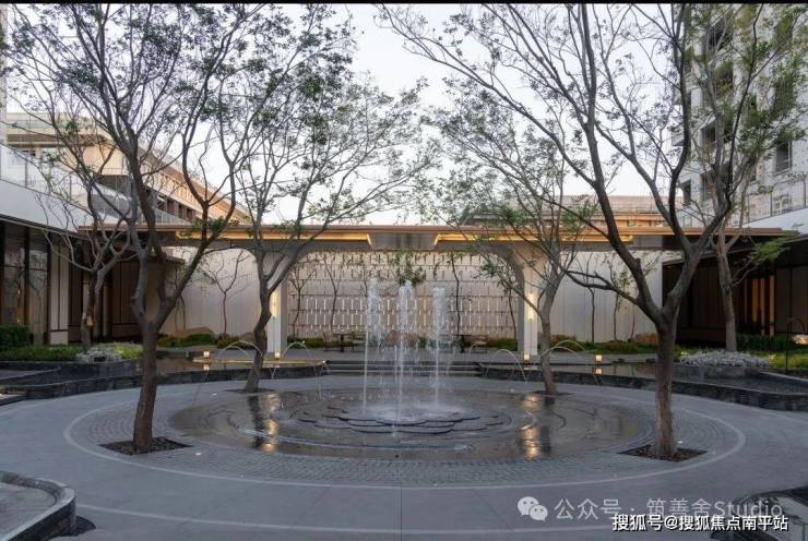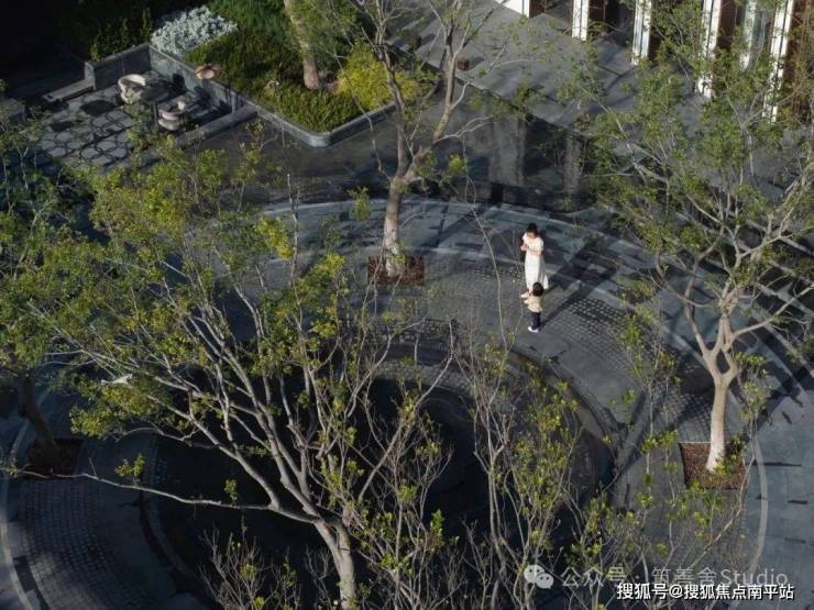 融合四颗精选朴树,旱喷广场打造出中心聚合的舒适空间,营造出轻松愉悦的生活烟火气息。