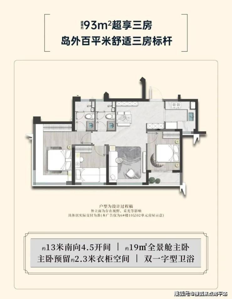建面约93㎡三房:做到约13米南向4.5开间,客厅及三卧室、厨房全朝南。创新设置“冰箱式”独立入户玄关,超容收纳空间。主卧带约7米无柱双飘窗并预留2.3米衣柜空间;三个房间均可轻松摆放1.5米床+床头柜+衣柜;可以说是岛外百平内舒适三房标杆。
