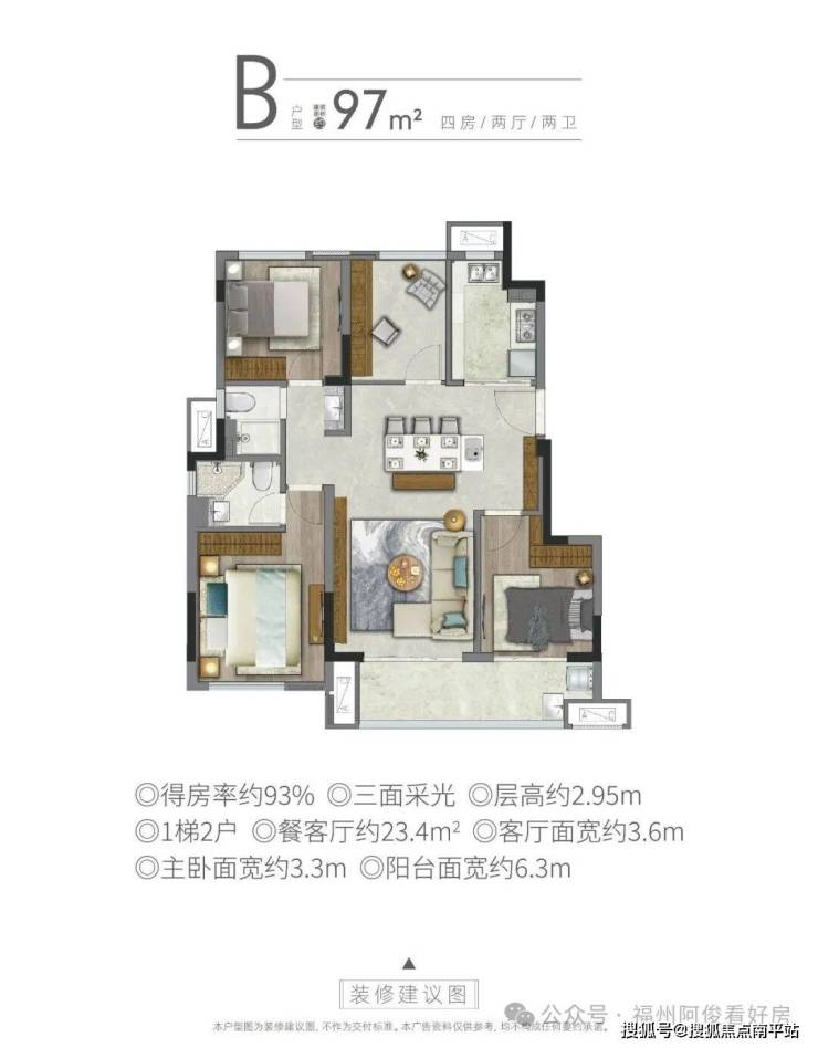 108㎡四房两厅两卫:南北通透,双联阳台,空间尺度舒适,主流热门户型。
