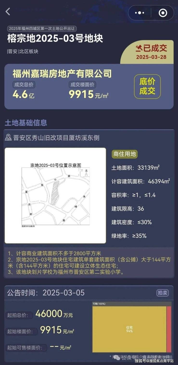福州嘉瑞房地产有限公司(隶属:国贸地产)于2025年3月28日以底价4.6亿竞得榕宗地2025-03号地块,成交楼面价9915元/㎡,地块允许建筑面积大于144平的产品做立体生态住宅;地块位于秀山山体公园西侧,呈长条形分布,地块内部无古建,东侧有个寺庙。