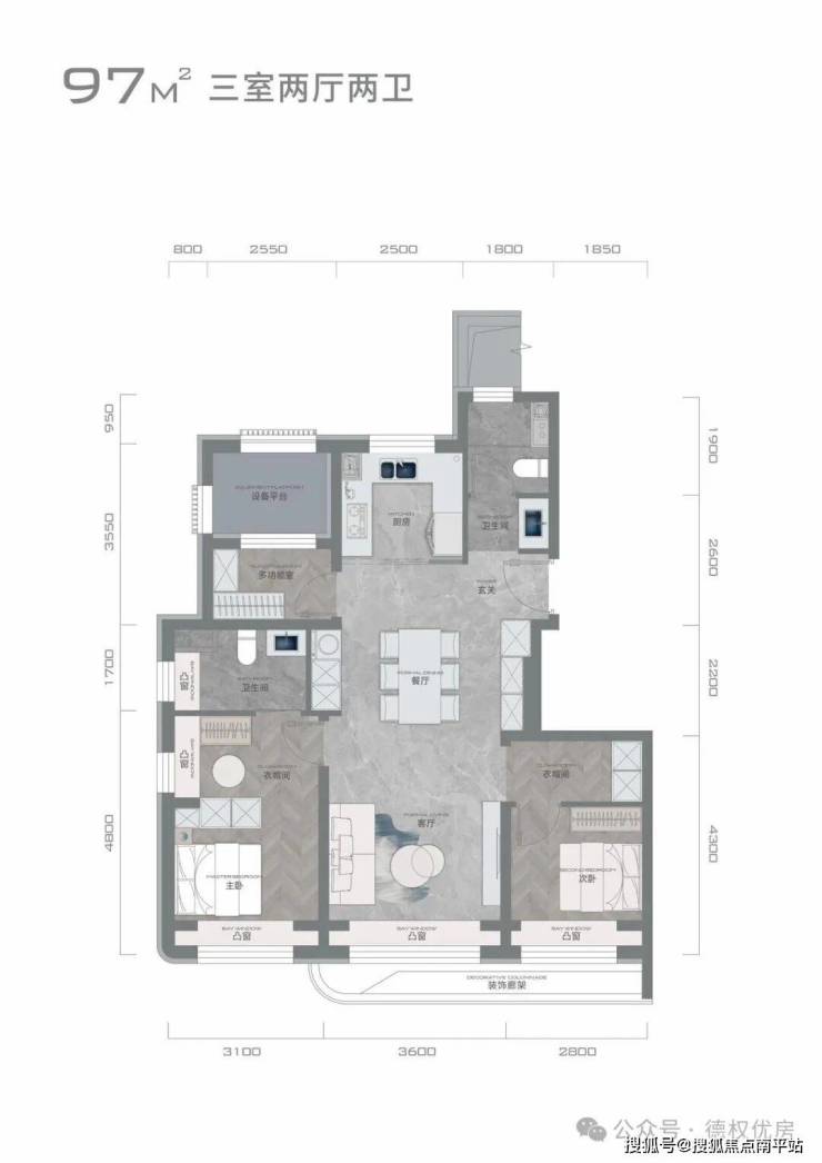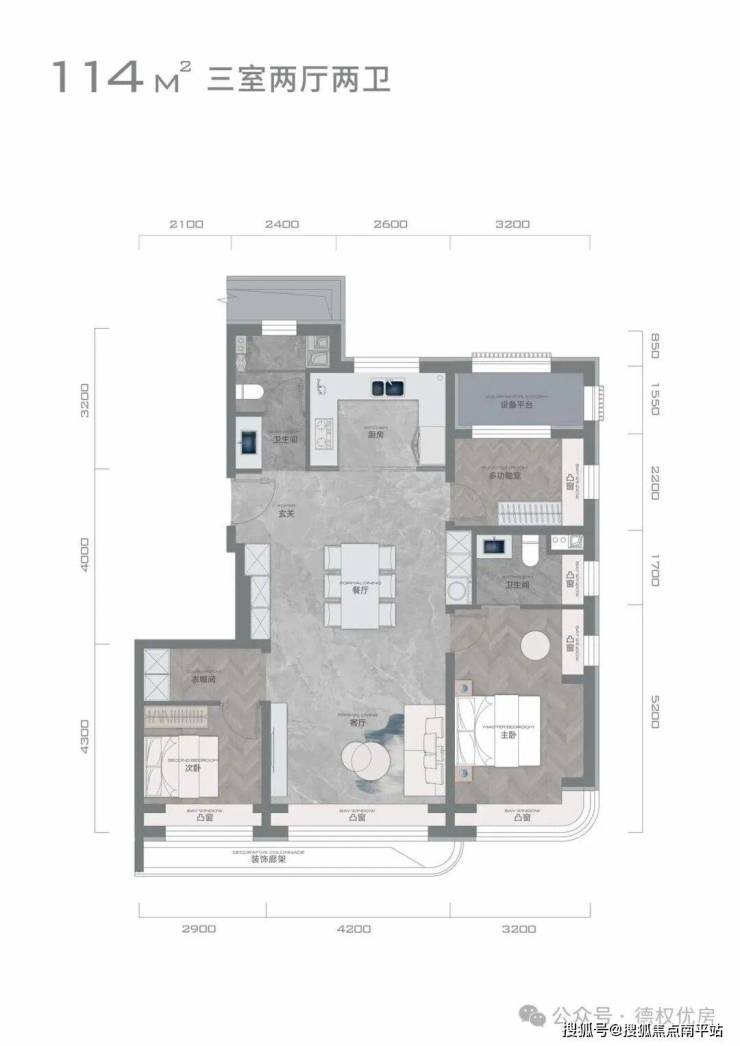 镜幕落地窗宽厅,为家庭活动提供宽敞的社交空间,聚会、娱乐皆能从容应对。114㎡、129㎡主卧享270°转角飘窗,换种视角看风景。