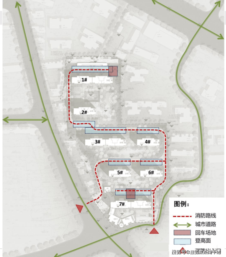 从消防扑救面的分布来看,除了2#、7#的南侧外,其余楼栋南侧都预留了相应绿化空间,1#东侧单元的南侧竖向,3#、4#的南侧横向,预留的绿化空间最足。