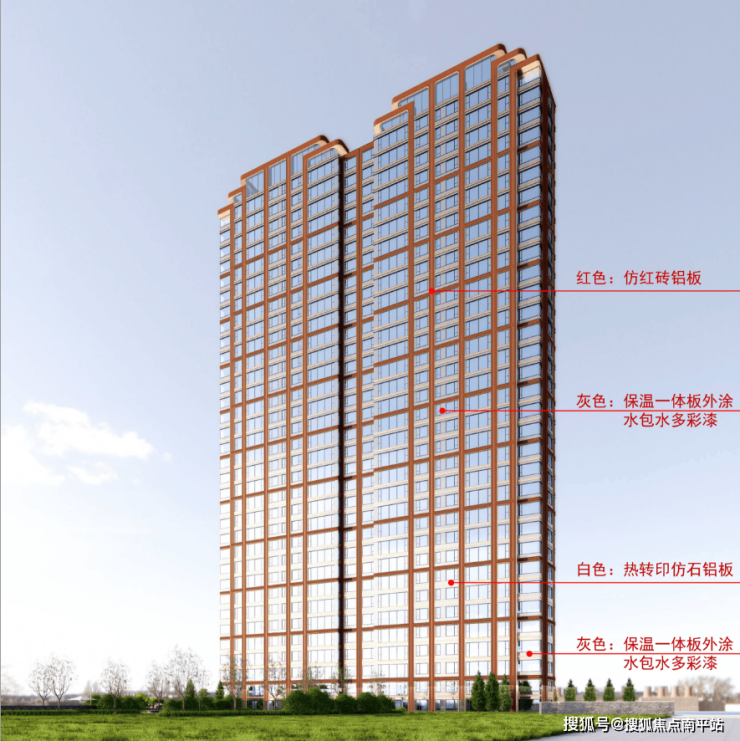 另外有个吐槽的一点是,百米住宅更多是用竖向线条凸出其挺拔的姿态,个人感觉横向的红砖色线条间距太密,没有突出竖向线条,如果红砖色线条从3层一道改为6层一道是否更好?