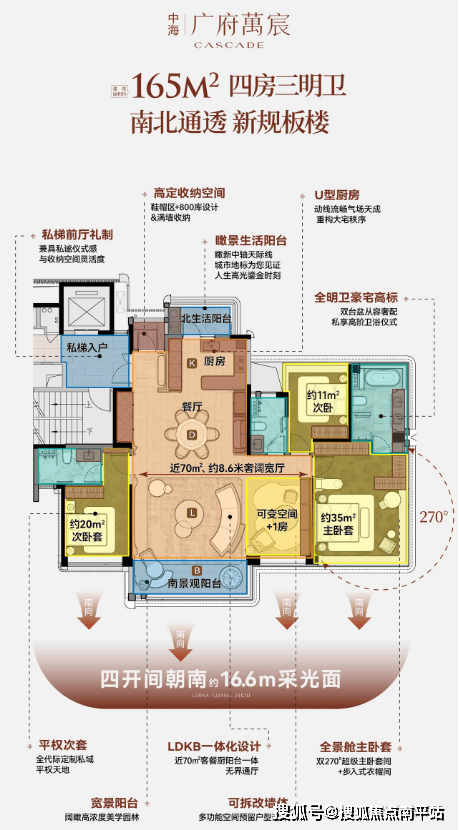 广府萬宸是中海在广州的首个萬字系,甚至可能是全国第一座。一共规划了3栋住宅,全都是南北对流的板楼,每栋26-28层不等,预计全盘货量150套左右。全盘只做了一个户型——约160-180平四房,因此圈层非常纯粹,不存在大户型和小户型混住的情况。