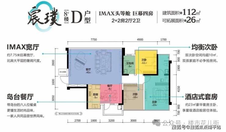 得房率均超 100% ,如112㎡户型直接 对标大平层 ,自带 约7.75米 阔奢大宽厅。