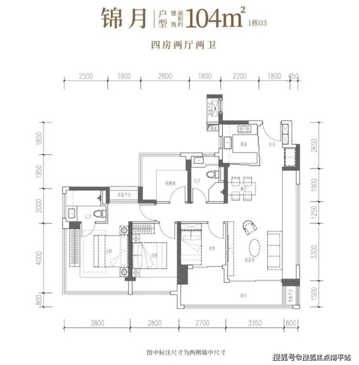 104㎡的4房2厅2卫 ,竖厅设计,客厅4.15米宽,LDKB布局,预留冰箱位,四房朝南。