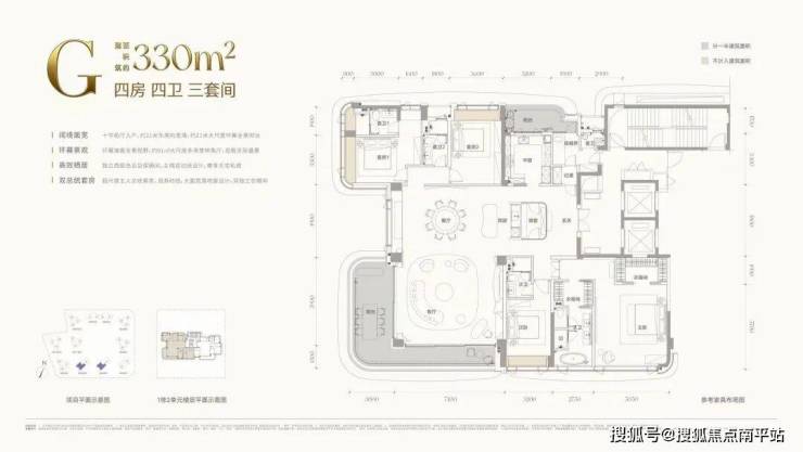 约330㎡(四房四卫三套间) :堪称“前海湾户型之王”。约21米东南向环幕阳台、7.4米阔厅、双总统套房尺度主卧,并配备独立家政套间与酒窖。这是为城市峰层人物定制的空中行宫。