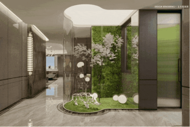 星空顶全精装车行归家动线,3米高星空入户车口,满足高档房车、重型越野、高级MPV各类富人用车,车库入口案名LOGO形象墙、VIP落客车马亭、电动平移门,车库上方标配劳斯莱斯星空顶,车行道上采用暖色系无机磨石地面,可以很大程度降低轮胎摩擦噪音。