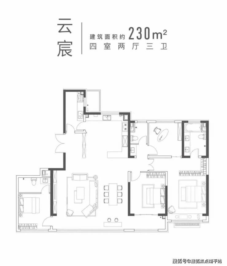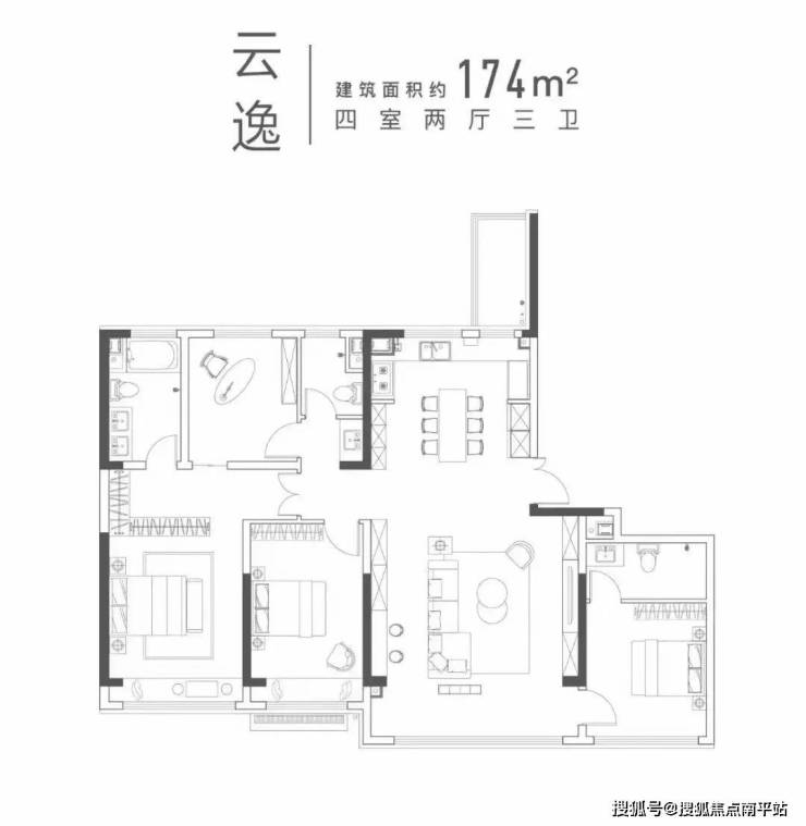 173㎡四室两厅三卫,三面宽,客餐厅南向,带270度大转角阳台,卧室两南两北,主卧送飘窗,南次卧连南阳台,户型中规中矩。