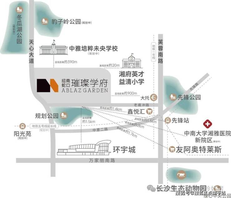 天心的整体建设,沿着天心大道(自天心中心-新开铺板块-黑石铺板块-解放垸板块)高速向南发展。而璀璨学府项目地处天心向南的关键枢纽处,北邻省府、西邻黑石铺及解放垸、南临中信商圈、东临红星,距离奥体中心(规划中)直线距离仅约3公里,享受成熟板块配套利好以及规划板块的未来红利