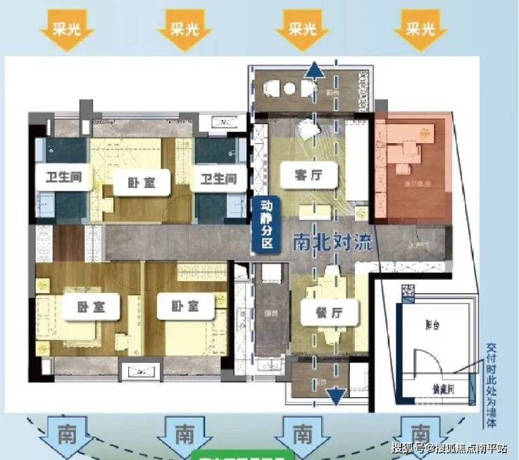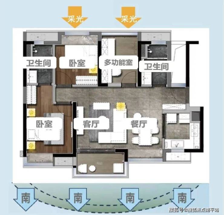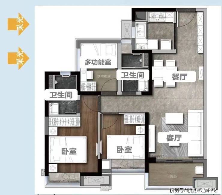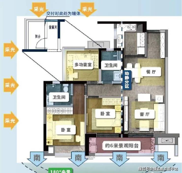 115㎡:三开间朝南南北对流,片区唯一115方四房带主套产品,双阳台设计