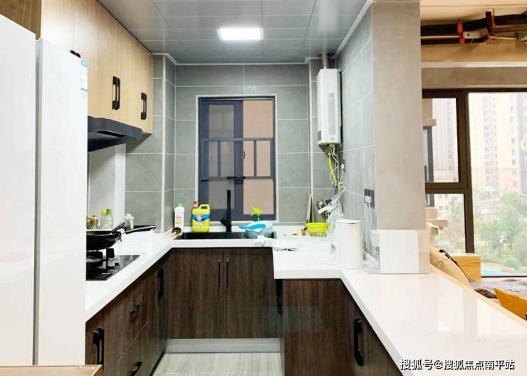 厨房墙面采用灰色瓷砖,空间视觉达到整体化一,吊柜未现场制作,U型台面往外延伸,动线合理,提高空间利用的同时还能增加与家人的交流。