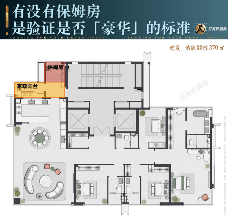 紫宸的270㎡户型,没有把对标一线挂在嘴上,而是用两个核心设计,把全国顶豪的服务逻辑变成了现实。