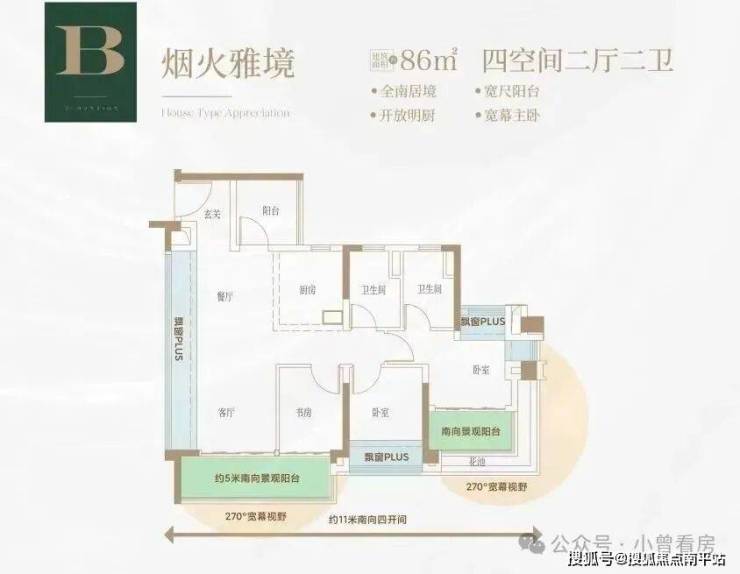 约11米全南向四开间,更大采光通风面,约5米长南向270°景观大阳台,豪华星级主卧套房设计,270°IMAX视野盛宴+三面通透采光,南望中央园景泳池,小户型的越级享受,畅享星级酒店的居住体验。