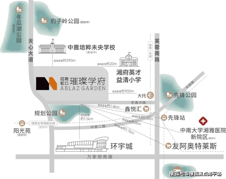 天心的整体建设,沿着天心大道(自天心中心-新开铺板块-黑石铺板块-解放垸板块)高速向南发展。而璀璨学府项目地处天心向南的关键枢纽处,北邻省府、西邻黑石铺及解放垸、南临中信商圈、东临红星,距离奥体中心(规划中)直线距离仅约3公里,享受成熟板块配套利好以及规划板块的未来红利