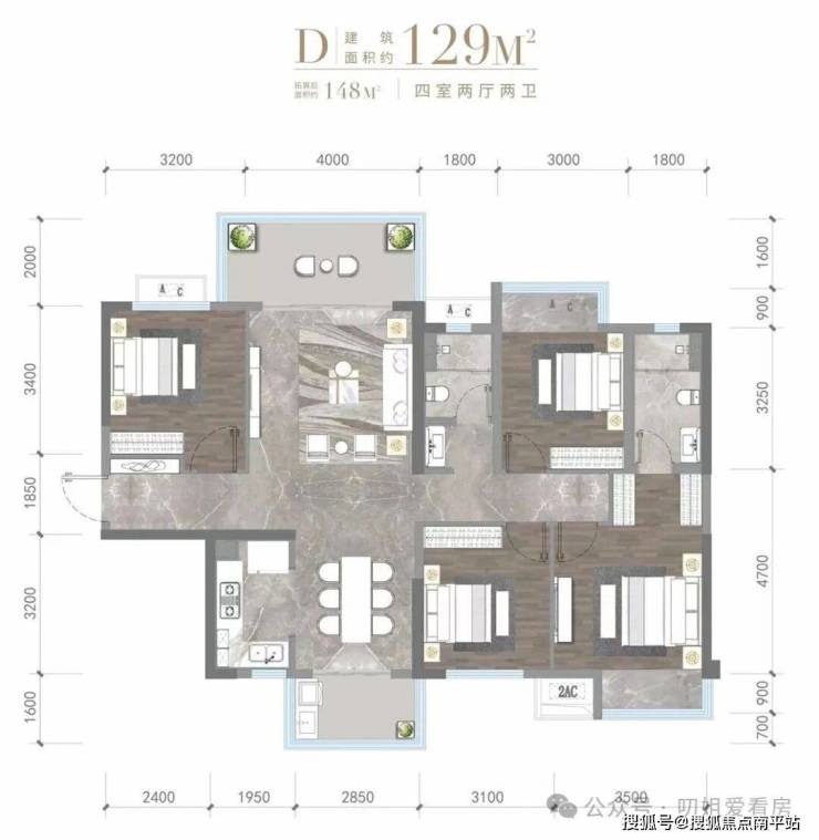 130㎡为大四房,双阳台对流,四个标准房间,舒适度挺高。