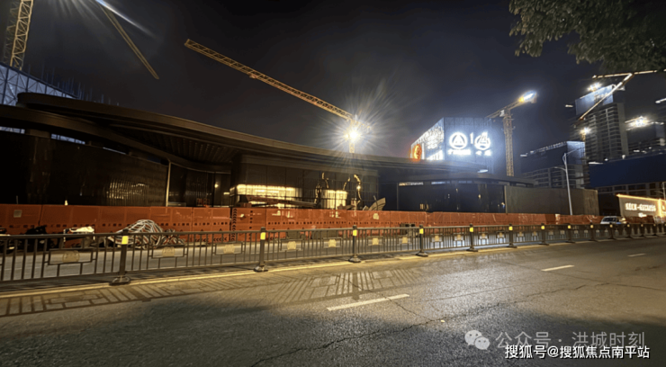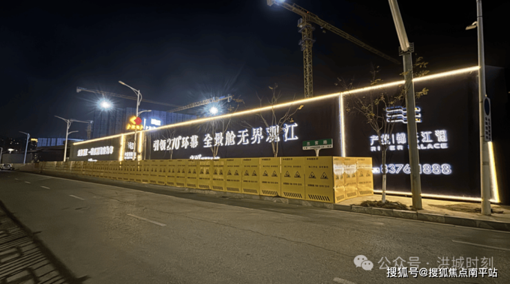 夜色中早已立起的蓝色围挡格外醒目,“头排瞰江,一线江河首序为尊”的标语直接锚定了项目的江景核心定位。