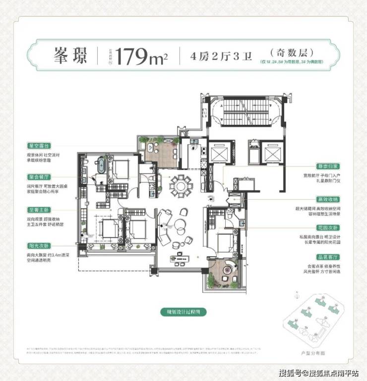 最后,户户奢享双露台,【偶数层】露台成为主卧私享,将酒店式奢享体验变为居家日常;【奇数层】露台与餐厅相连,进一步扩大公区,休闲、会客、商务洽谈等需求皆可在同一空间实现,且互不干扰。