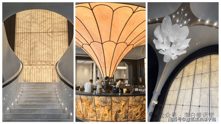 大门后的归家大堂,堪比国际奢华酒店的艺术前厅,深色澳洲巴沙尔灰石材墙面与艺术拼接的地面,大气;四面挑高“花瓣”墙面,搭配如花般绽放般的中央岛台立柱,寓意“万花献瑞”。